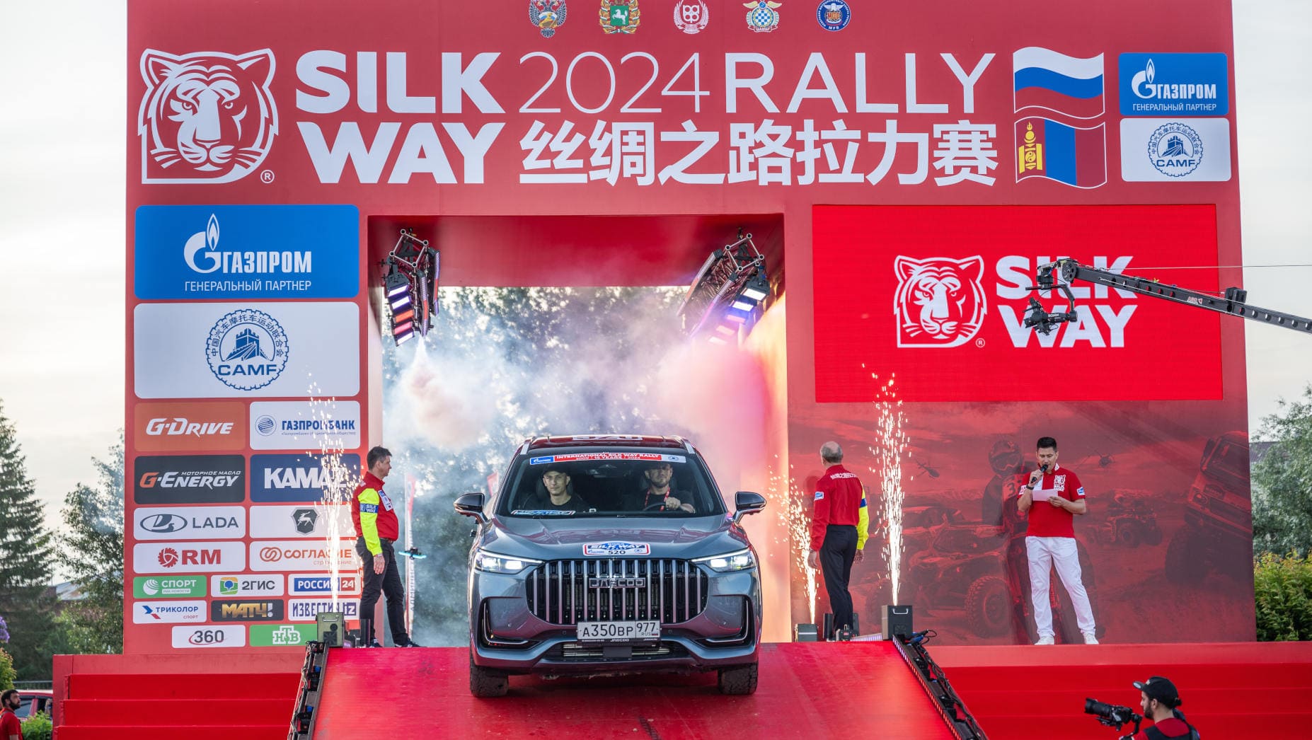 Большой маршрут ралли-рейда «Шелковый путь» начнётся лишь завтра, а сегодня короткий Пролог и официальная церемония открытия, где каждый участник проезжает через арку с остановкой на подиуме, машет огромной толпе болельщиков, провожающих гоночные экипажи в огромный путь.